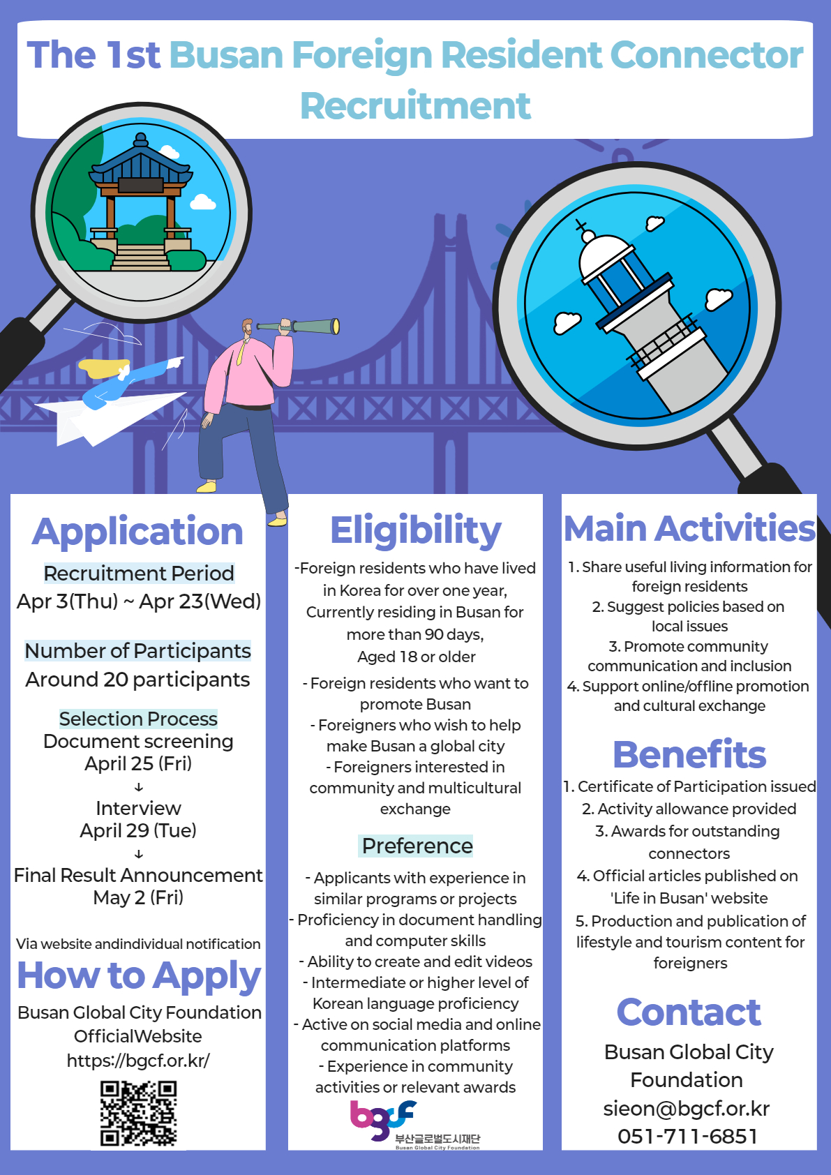Busan Metropolitan City and Busan Global City Foundation are recruiting the '1st Foreign Resident Connector' targeting foreign residents in Busan.