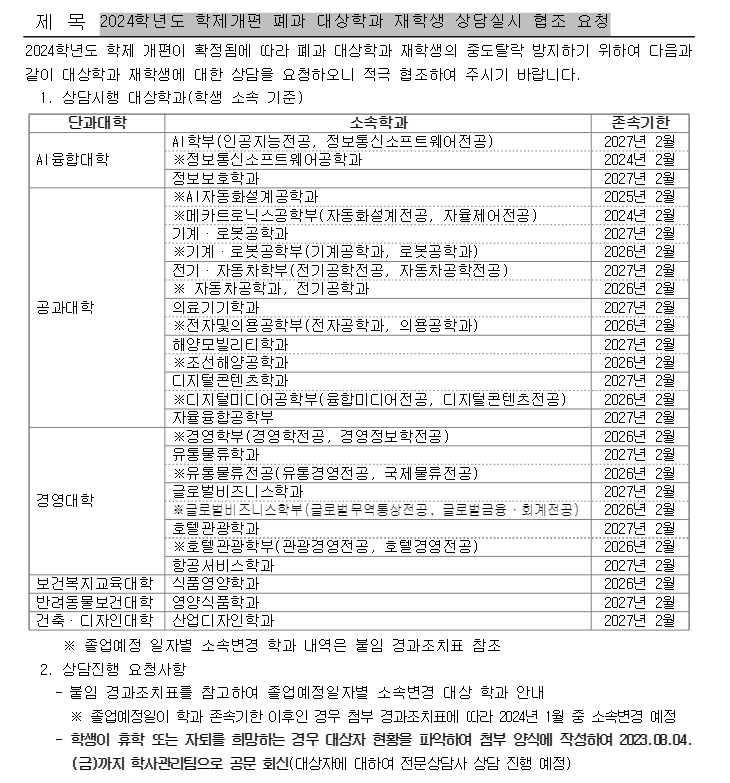 [공지] 2024학년도 학제개편 폐과 대상학과 안내(식품영양학과 및 영양식품학과 모두포함)