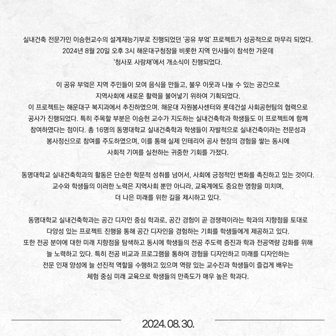 실내건축학과 재능기부의 결실: 청사포 사랑채 공유부엌