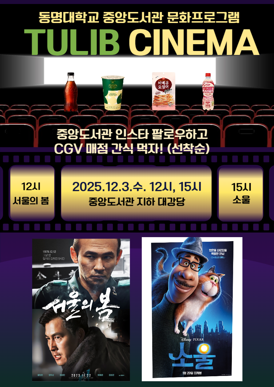중앙도서관에서 진행하는 도서관 문화프로그램인 영화상영회 <TULIB CINEMA>를 안내드립니다.