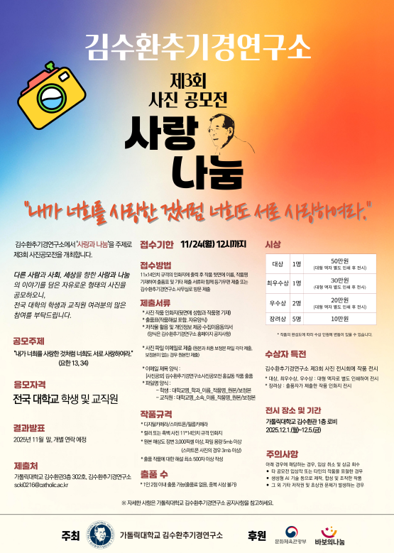 1. 가톨릭대학교 김수환추기경연구소에서 '사랑과 나눔'을 주제로 제3회 김수환추기경연구소 사진공모전을 개최합니다. 다른 사람과 사회, 세상을 향한 사랑과 나눔의 이야기를 담은 자유로운 형태의 사진을 공모하오니 많은 관심과 협조 부탁드립니다.