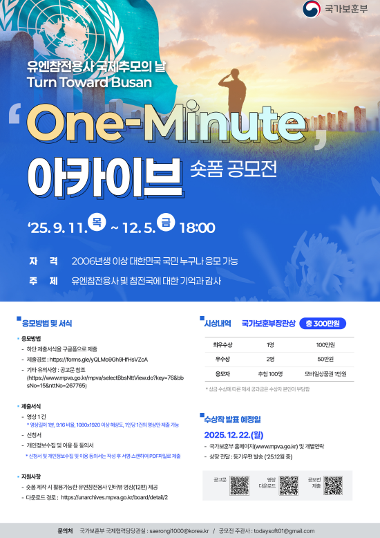 국가보훈부는 22개국 유엔참전용사에 대한 기억과 감사의 메시지를 확산하기 위해, 유엔참전용사 디지털 아카이브에 탑재된 유엔참전용사 인터뷰를 활용한 숏폼 공모전을 아래와 같이 연장하여 추진하고 있습니다.